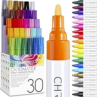 Stylos à peinture pour toutes les surfaces, peinture rupestre, céramique, verre, bois. 30 stylos de Chromatek. Astuce moyenne. Permanent. Séchage rapide. Tutoriels vidéo en ligne et ebook inclus …