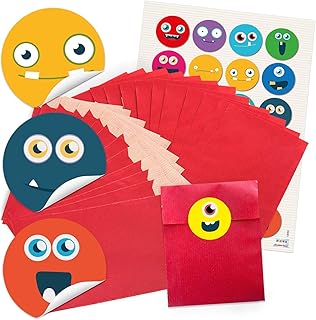 24 petits sacs papier rouges autocollants pour emballage de cadeaux (9,5 x 14 cm) et 24 ronds multicolores drôles de visages Smiley Faces Emoji autocollants Bleu Rouge Jaune Vert pour le bricolage.
